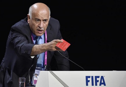 President of the Palestinian FA Jibril Rajoub shows a red card as he speaks during the 65th FIFA Congress on 29 May 2015 in Zurich (AFP)